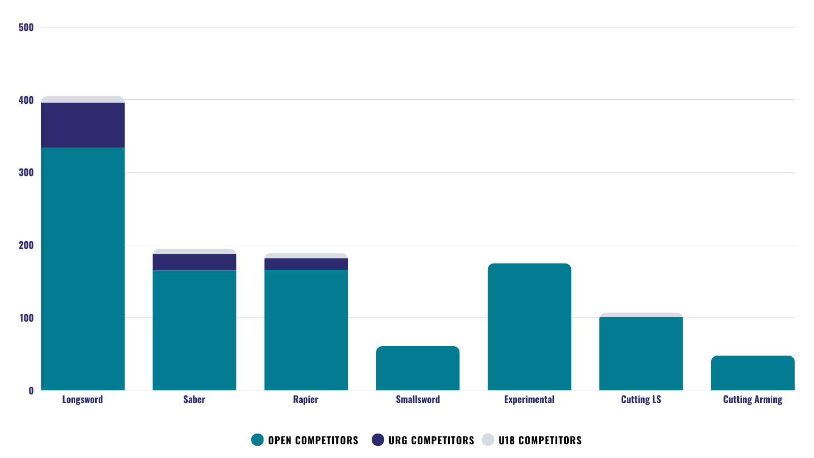 This area chart shows SoCal Swordfight’s rapid attendance growth, with total attendance increasing over 350% since 2015. The event attracts more competitors, participants, and attendees every year, reflecting its role as the world’s leading HEMA tournament and expo.